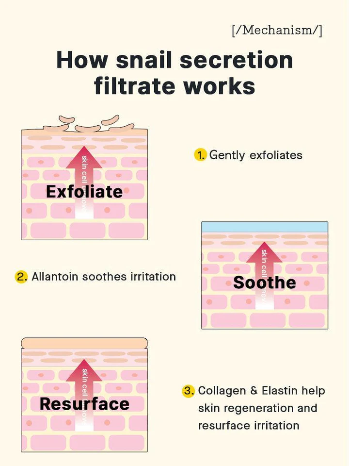 Snail Secretion Filtrate, Betaine, Caprylic/Capric Triglyceride, Cetearyl Olivate, Sorbitan Olivate, Sodium Hyaluronate, Cetearyl Alcohol, Stearic acid, Arginine, Dimethicone, Carbomer, Panthenol, Allantoin, Sodium Polyacrylate, Xanthan Gum, Ethyl Hexanediol, Adenosine, Phenoxyethanol