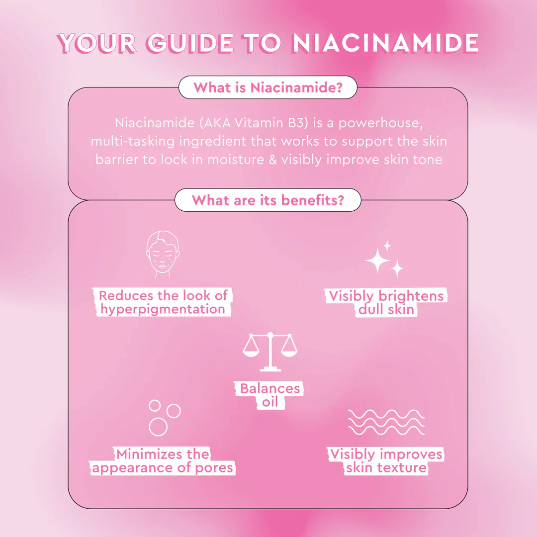 - Niacinamide: Visibly reduces the look of hyperpigmentation and of pores over time.